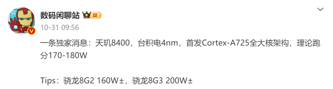 同时,该博主此前爆料显示,天玑8400理论跑分170-180W,表现好于骁龙8 Gen2的160W±,但不足于骁龙8 Gen3的200W±。