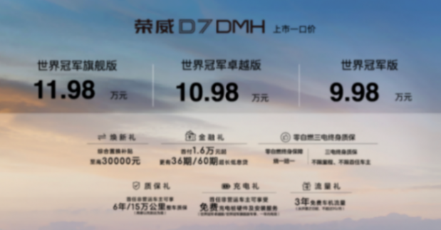 荣威D7 DMH世界冠军版共推出3款车型,官方零售价12.38-14.38万元,全系限时享24,000元现金优惠,一口价低至9.98万元起。双车均享至高30,000元置换补贴,以超值权益带来进阶的价值体验。