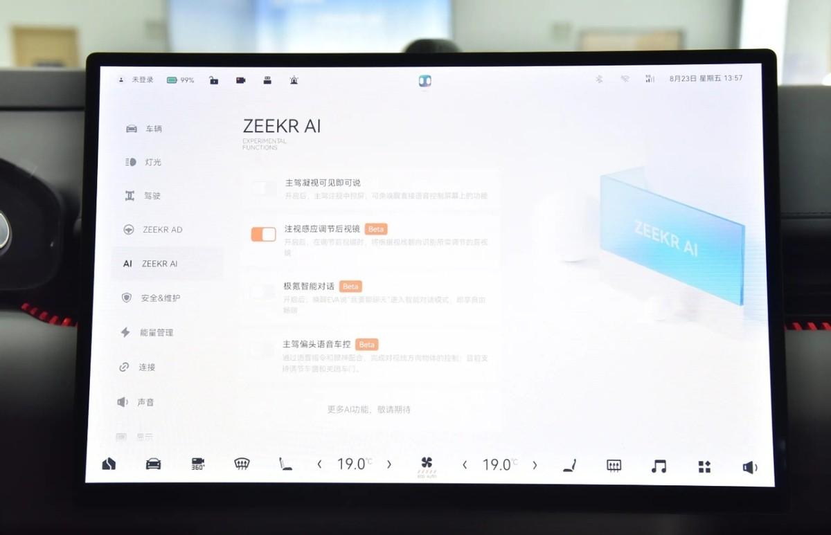 智能化一直以来都是极氪的软肋,但是今年改款之后也有了很大的进步。同样使用了8295芯片,Kr AI大模型的加入让智能座舱体验化有了大幅升级。语音助手Eva甚至可以根据用户习惯来主动提供用车建议,如主动提供更优路线、主动拉紧安全带、主动推荐服务器等等。