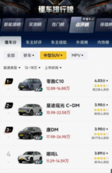 除了产品力之外,我们还需要了解一下这款车的口碑。据懂车帝12-18万元中型SUV口碑榜显示,零跑C10的用户评分高达4.59分(基于767人参与评价),在同级车型中还是比较有优势的。