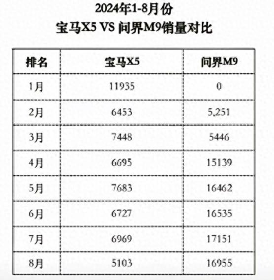 但宝马X5随后的好日子基本也到头了,因为2月份问界M9开始正式交付。出人意料的就是,2月份问界M9与宝马X5的销量差距只有1200辆左右了。今年3月份,宝马X5的优势扩大到了2000辆,但好运没有再次上演,紧接着4-8月份问界M9的月销维持在了1.6-1.7万辆左右,而宝马X5的月销维持在5000-7000辆左右。问题来了,为何当初宝马X5能够冲到1.2万辆,现在下滑如此明显呢?很明显,问界M9以及理想L9取代了不少宝马X5的市场份额。