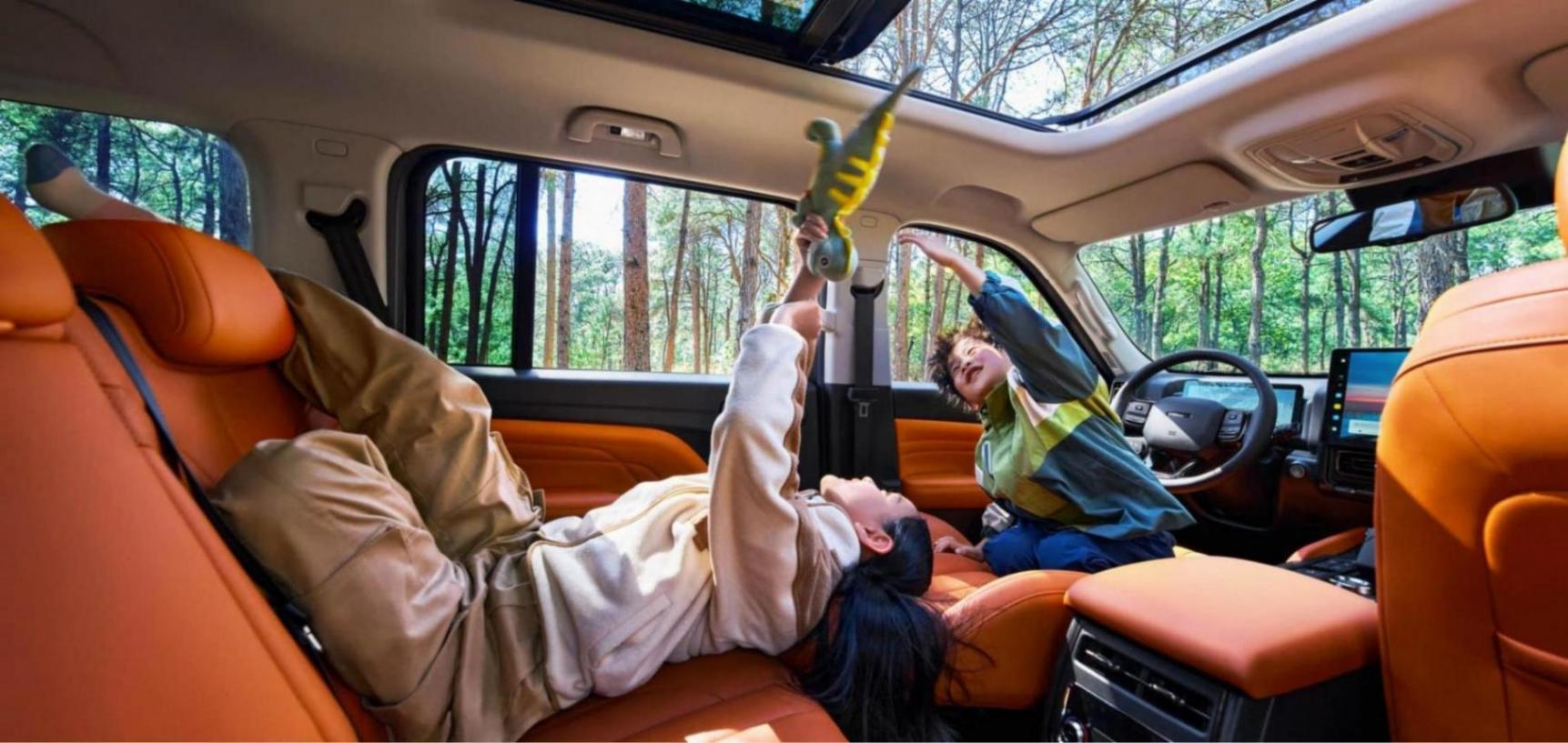 内饰设计更加偏向一辆豪华的SUV,而非硬派越野。整个内部采用了大量的双拼色内饰风格,棕色加黑色也是当下最为主流的设计。此外,配置部分给得很满,比如可开启全景天窗,14.6英寸的悬浮式大屏,应用商店,语音控制系统,10.25英寸的全液晶行车电脑,自动防眩目内后视镜,手机无线快充,带座椅加热通风按摩的多功能皮质座椅。值得一提的是,该新车居然还可以选择2+3+2的7座配置。