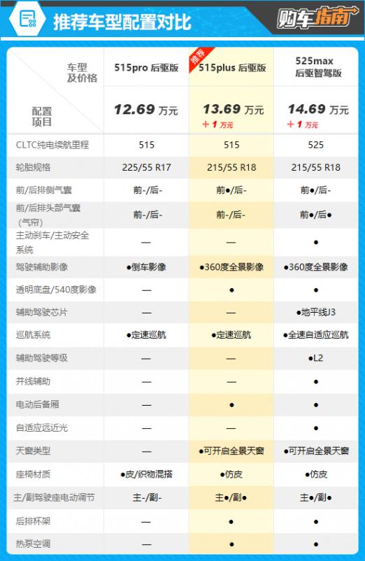 推荐车型为515plus 后驱版,售价13.69万元。作为次顶配车型,其相较低一个配置车型主要增加了部分安全性和实用性配置,例如前排侧气囊、360度全景影像、主/副驾驶座电动调节以及热泵空调等。虽然1万元的差价并不便宜,但是考虑到增加的这些配置确实能够有效提升“幸福感”,因此还是建议进行升级。