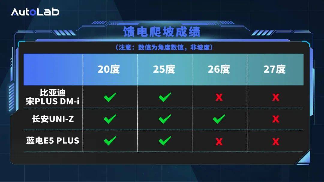 第一项挑战是爬坡测试,由于三台车在测试时均处于馈电状态,所以这轮测试,更多考验的是电机和发动机的综合扭矩。(注:爬坡数值为角度数值,非坡度)