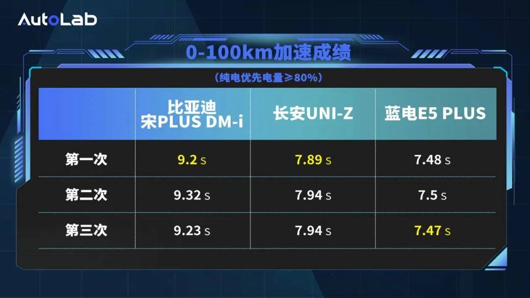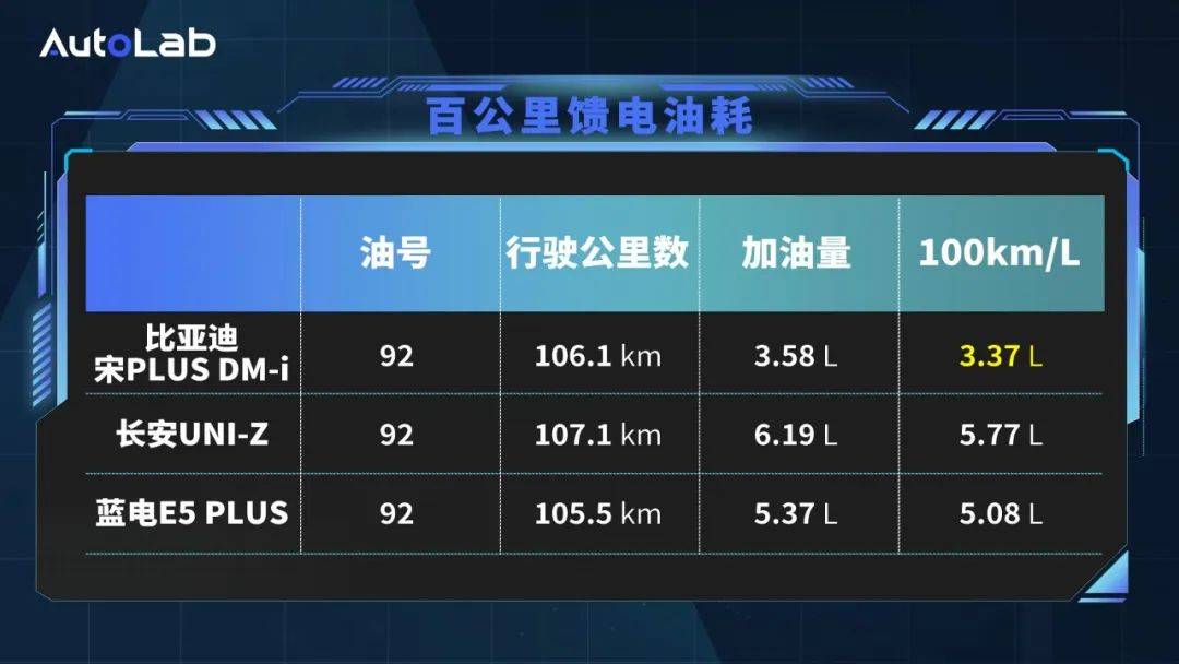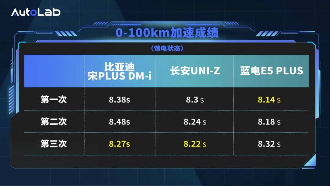 所以在本轮测试中,UNI-Z取得冠军,蓝电E5 PLUS和宋PLUS DM-i平局。