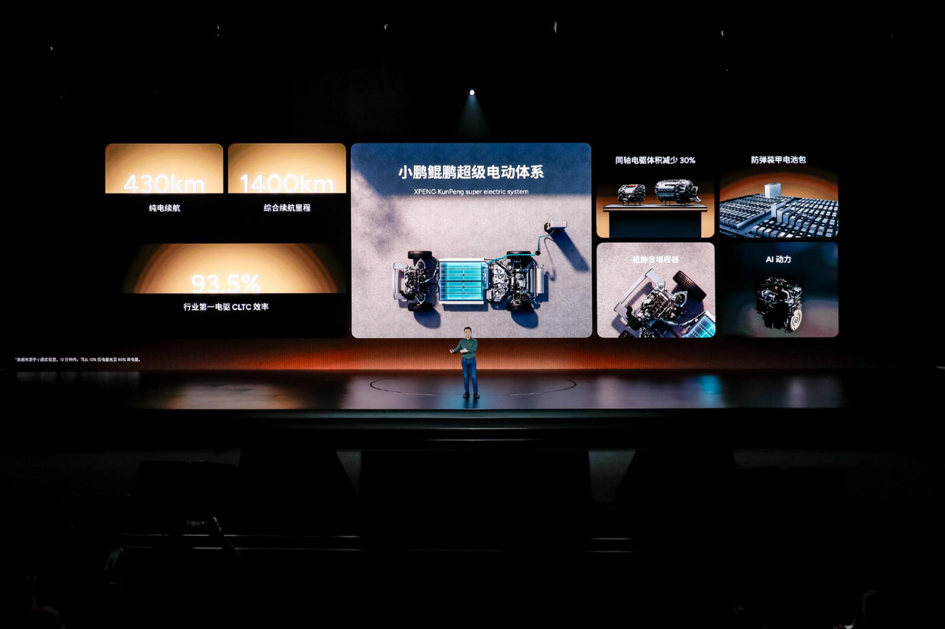 续航补能方面,鲲鹏超级电动体系的纯电续航里程可达430km,综合续航里程超过1400km,5C超充可实现1s补能超过1km。