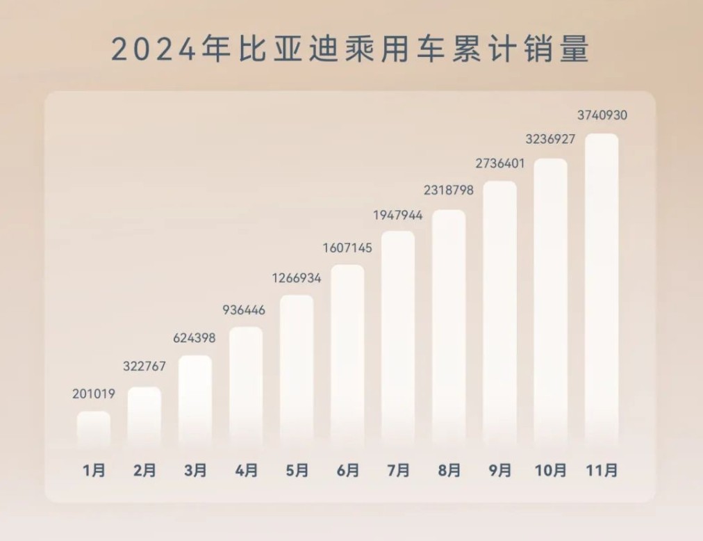 截止到11月份,比亚迪在今年的累计销量已经达到了374.09万辆,创下了品牌历史销量新高。而在年初的时候,比亚迪对今年定下的销量目标为360-400万辆,仅在11月份就已经提前超额完成了这一目标,按照比亚迪目前的表现,全年销量超过400万辆也并不存在太大问题,是2024年最大的赢家。