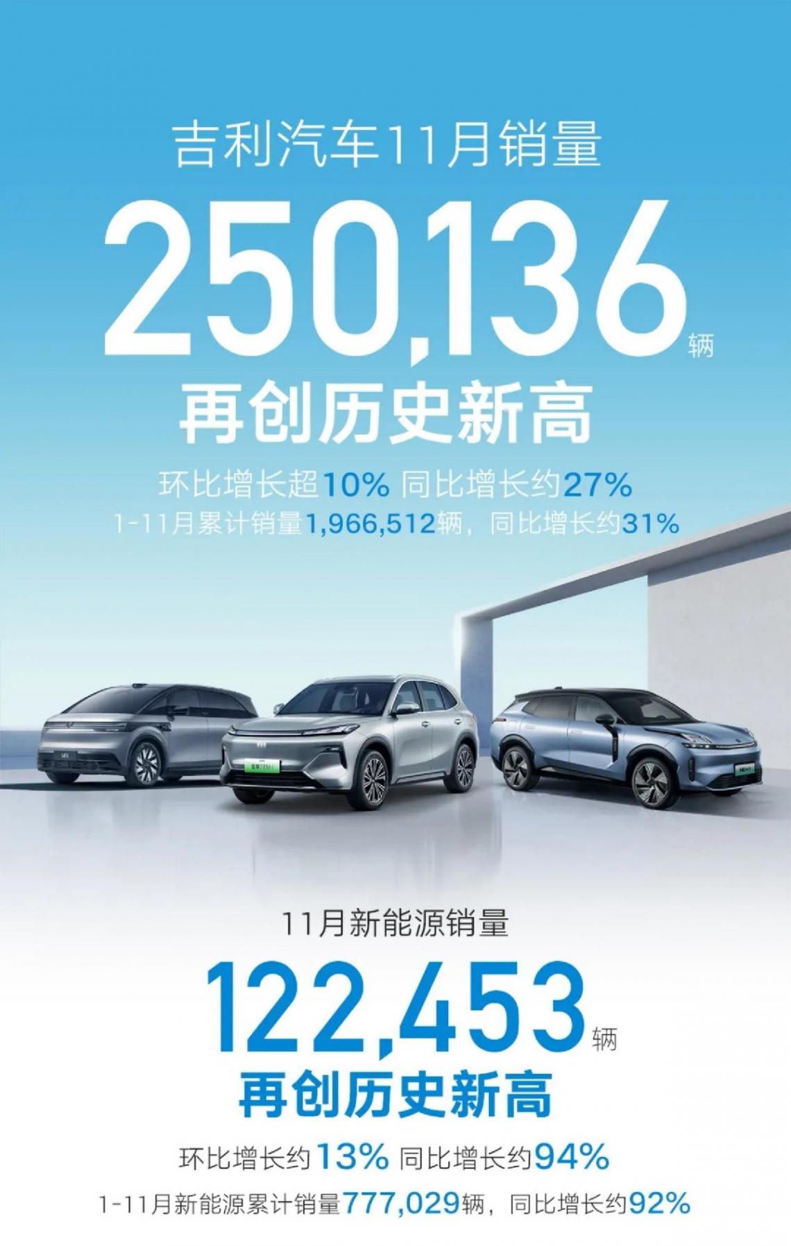 在吉利汽车这边,11月份销量直接达到了250136辆,品牌首次单月销量突破了25万辆,同比大增27%。截止到11月份,吉利汽车今年的累计销量也已经达到了1966512辆,实现了31%的同比增长,而在年初的时候吉利汽车定下的销量目标为200万辆,现在仅有着不到4万辆的差距,完全可以提前开香槟。
