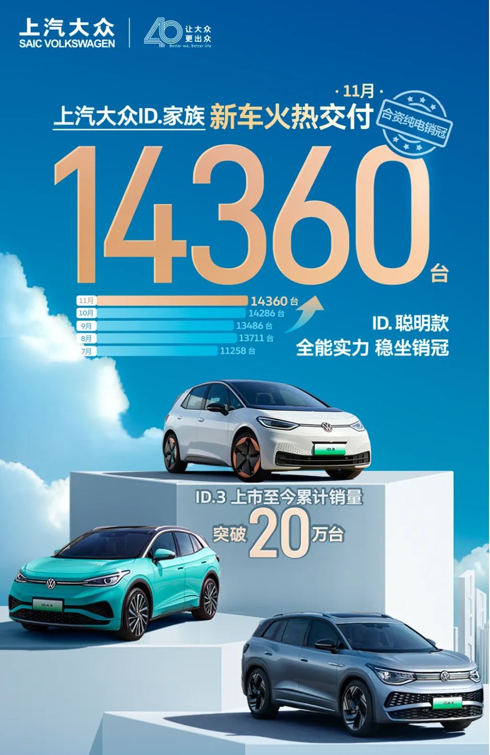 从销量来看,上汽大众ID.家族在11月份销量就达到了14360辆,这一成绩虽然只能勉强和主流新势力品牌相提并论,但在合资品牌中,上汽大众ID.家族却是最成功的案例,且ID.3从2021年上市以来的累计销量也已经突破了20万辆。