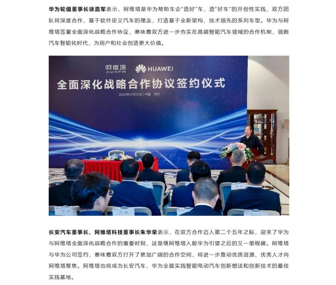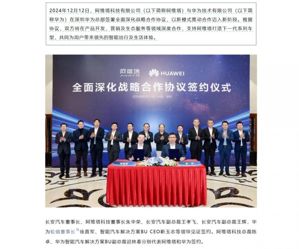 停盘后才发的,阿维塔与华为,签署全面深化战略合作协议。