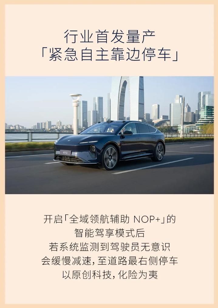 在智慧安全层面,ET9 此次升级的核心亮点是行业首发量产紧急自主靠边停车功能。该功能基于全域领航辅助 NOP + 系统,当监测到驾驶员失去意识时,车辆将自动缓慢减速并驶向道路最右侧停车。
