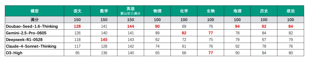 除了数学、化学和生物之外,豆包的成绩依旧是名列前茅,6个科目均是第一。