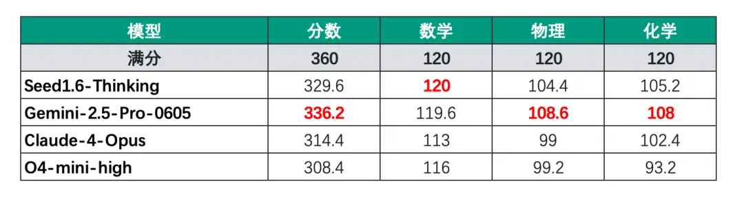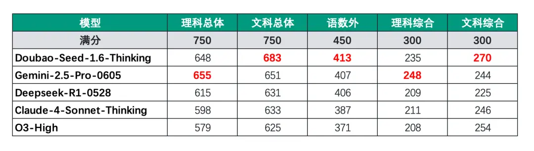 按照传统文理分科计分方式,Gemini的理科总成绩655分,在所有选手里排名第一。豆包的文科总成绩683分,排名第一,理科总成绩是648分,排名第二。