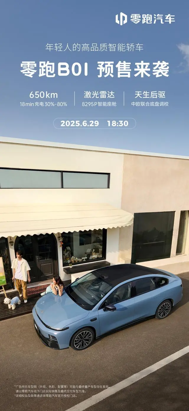 6 月 26 日消息,零跑汽车官微今日宣布,定位“年轻人的高品质智能轿车”的新车 B01 将于 6 月 29 日 18 时 30 分开启预售。新车号称是 15 万元级新能源轿车越级之作,具有颜值、续航、智能、品质、驾控 5 项全能。