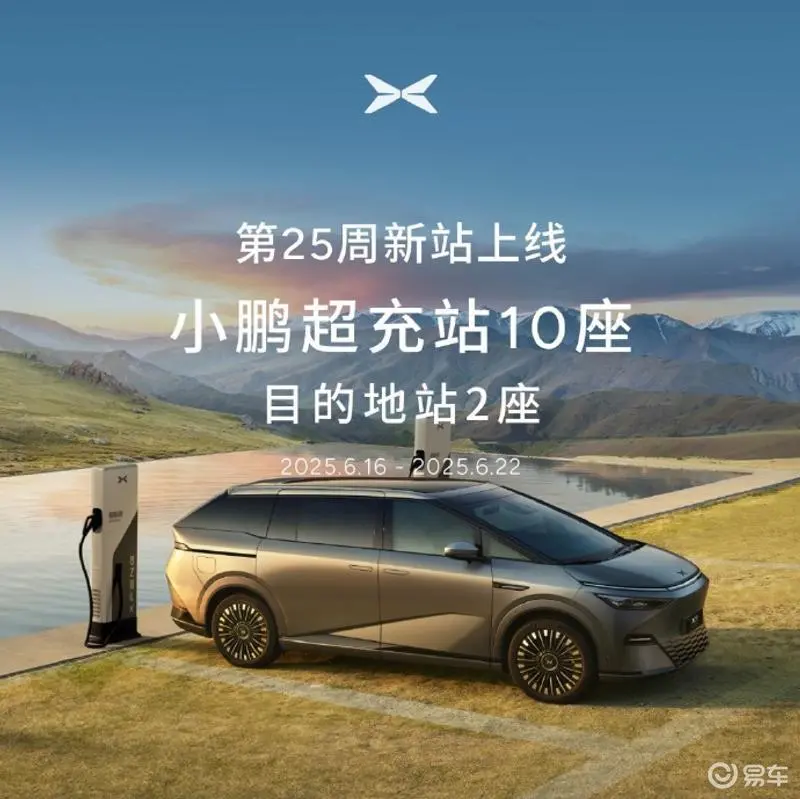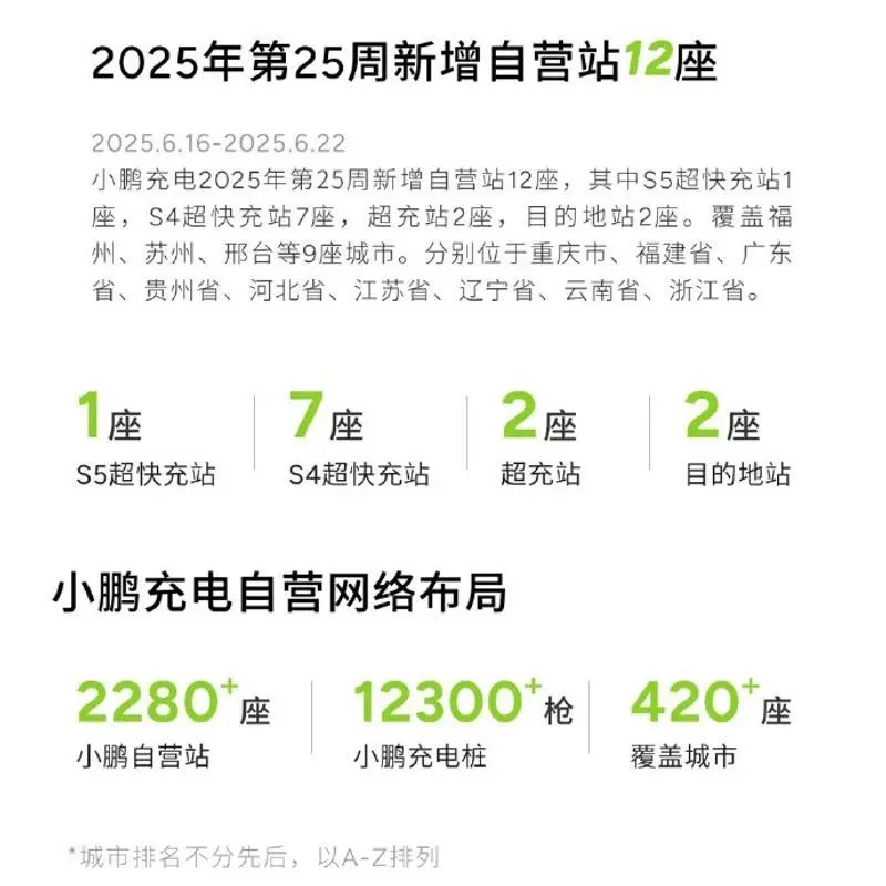 近日,小鹏汽车官方微博宣布,小鹏充电2025年第25周新增自营站12座,其中S5超快充站1座,S4超快充站7座,超充站2座,目的地站2座。