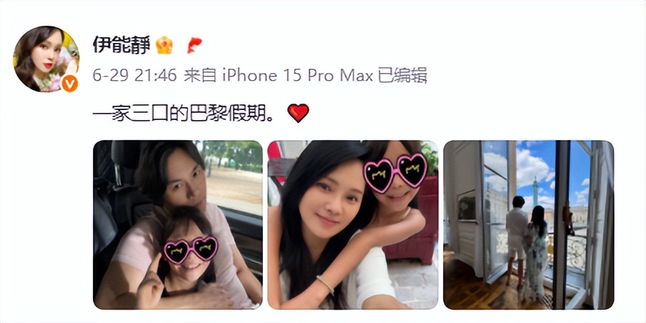 6月29日,伊能静微博晒出一家三口度假照,并配文“一家三口的巴黎假期”。