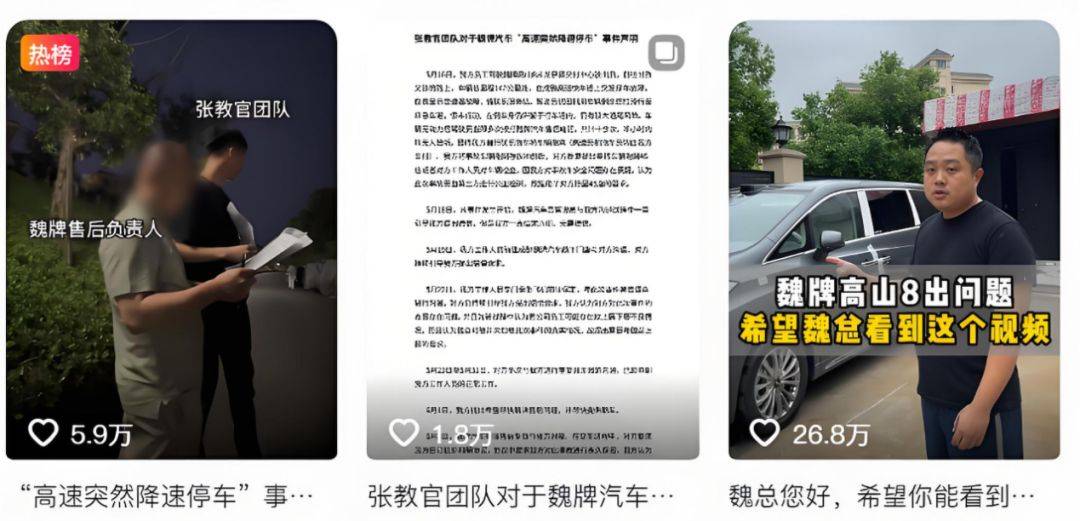 2025年7月2日,抖音粉丝超700万的视频博主“张教官的有趣人生”发布视频,控诉其新购的魏牌高山8在高速路上突发动力中断险酿事故,并表达了因魏牌处理不力,希望通过视频引起长城汽车董事长“魏总”关注的意愿。