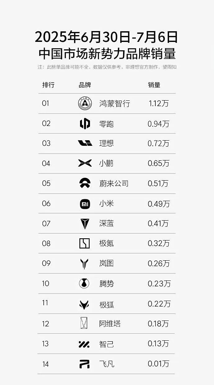 鸿蒙智行、零跑、理想,销量分别为 1.12万辆、 0.94万辆、0.72万辆。
