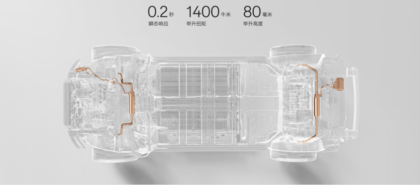 底盘方面,新车搭载闭式双腔空气悬架+双阀CCD电磁减振系统,最大调节行程110mm,最大离地间隙288mm。此外,依托于极氪自研的定海智能中枢,极氪9X可覆盖10种全地形驾驶模式,拥有全地形通过能力。值得一提的是,极氪还在9X上实现了48V主动稳定杆技术,最快仅需0.2秒即可瞬间产生1400N·m的举升扭矩,实现最高80mm的举升效果。
