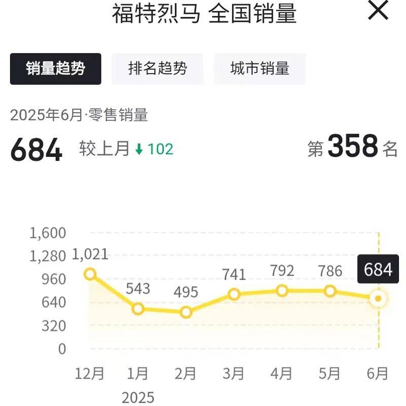 并且今年1-6月份,福特烈马的销量分别为543辆、495辆、741辆、792辆、786辆、684辆,6个月加在一起的累计销量为4041辆。平均单月销量不足680辆。