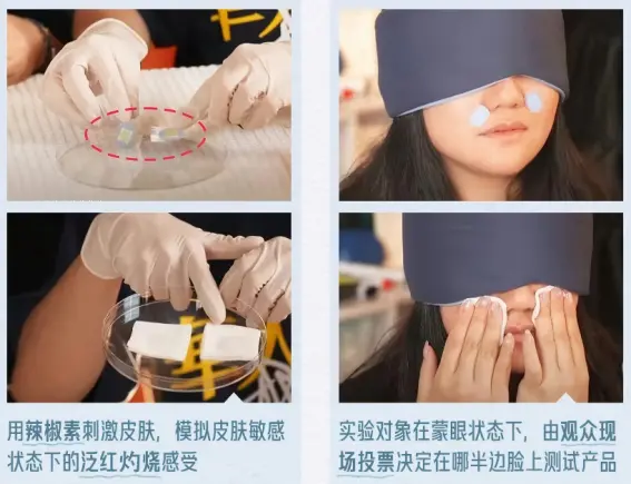 在卖一款冷静精华时,李嗲让蒙眼受试者用辣椒素刺激不同部位的皮肤,模拟皮肤敏感状态下的泛红灼烧感;再根据用户现场投票,在不同部位使用不同的产品,最后让受试者如实反馈感受。带货产品必须足够优秀,才能在单盲测试中胜出;而测试结果也比主播个人推荐更加令人信服。