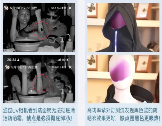 粉丝们很快发现,李嗲主打“劝退式带货”。比如,在给一款防晒霜带货时,李嗲认为这款产品防水效果很好;但她通过UV相机发现,普通的洗面奶无法清除防晒霜,必须用卸妆产品才能彻底清洁。