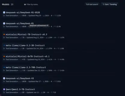 如今,在Hugging Face上按“热度”排序检索,以文本模型为例,DeepSeek R1/V3、LLaMA3.2/3.3、Qwen2.5以及来自法国的Mistral系列模型均位居前列,这些开源模型的下载量在几十万到上百万不等。这表明开源极大地促进了行业的进化。目前,Hugging Face平台上共有超过150万个模型,其中绝大多数是用户基于开源架构的衍生产物——sft微调版本、LoRA微调版本等。