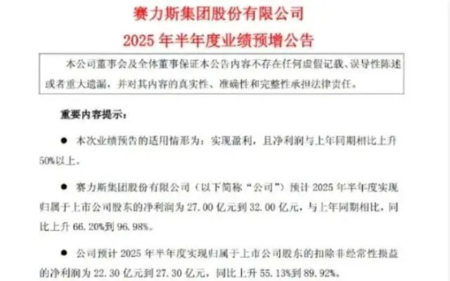 7月10日晚间,赛力斯发布的2025年半年度业绩预增公告在资本市场投下一枚“深水炸弹”。在整体销量下滑15.77% 的背景下,公司预计上半年归属于上市公司股东的净利润达到27亿元到32亿元。