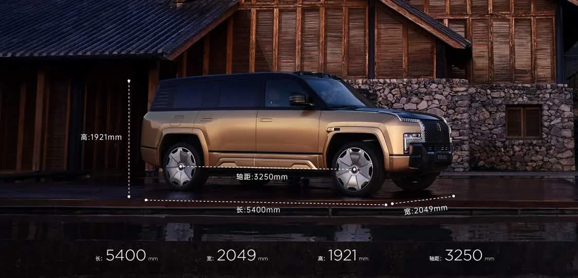 侧面来看,侧面造型较为方正、平直,略微向外凸出的轮拱肌肉感十足。另外,仰望U8还采用了隐藏式车门把手设计进一步提升其时尚感。并且,新车还提供22英寸、23英寸轮毂可选,大饼式的轮毂造型,豪华感十足。车尾部分,两侧造型锐利的尾灯组点亮后极具辨识度。尺寸方面,仰望U8L长宽高分别为5400/2049/1921mm,轴距为3250mm,相比仰望U8豪华版轴距增加200mm,定位全尺寸行政豪华SUV。