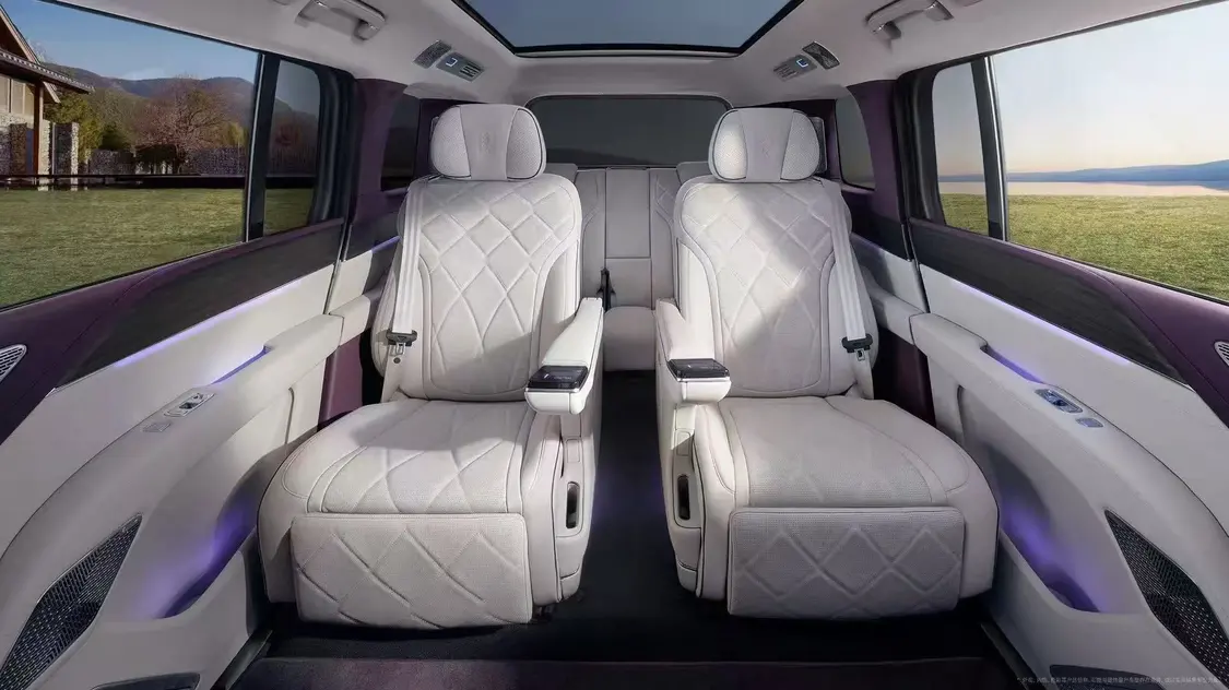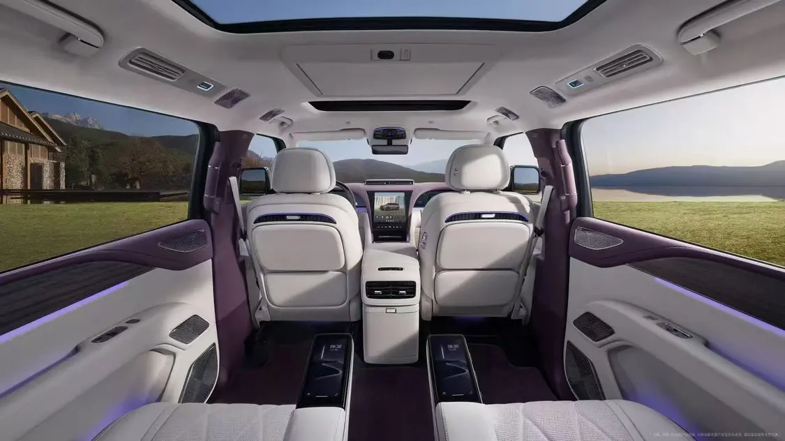 座椅方面,仰望U8L采用2-2-2的六座布局,三排座椅均采用软性皮质包覆,并且新车二排还采用独立座椅,整体的座舱舒适体验进一步提升。值得一提的是,新车还配备了一个大尺寸的后排吸顶屏,车载冰箱、后排座椅扶手液晶屏幕、多色氛围灯等配置通通安排。