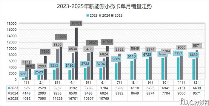 纵观2023-2025年6月新能源小微卡销售走势可见,2025年1-6月,新能源小微卡一季度呈现直线上涨态势,在3月冲上顶峰。二季度单月销量远超去年的同时,销量在5-6月趋于平稳,但单月销量均突破1万辆。
