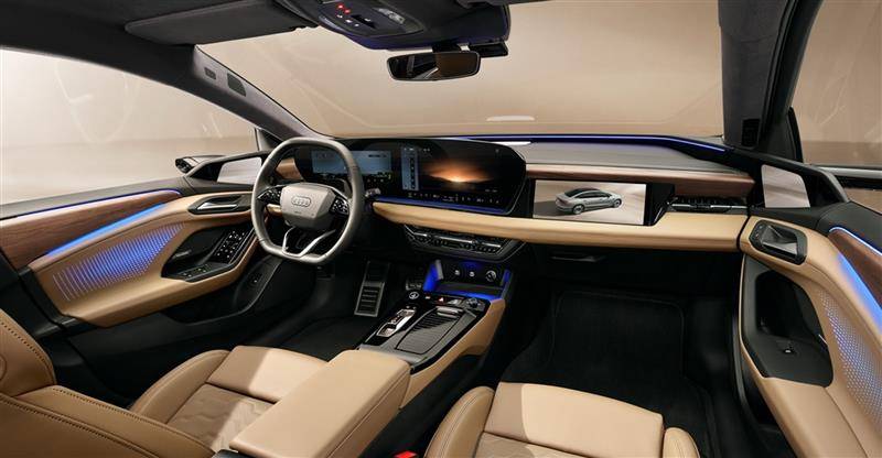 内饰部分,A6L e-tron将配备由11.9英寸虚拟座舱仪表屏+14.5英寸MMI中控屏构建的高清曲面一体屏,以及带防窥技术的10.9英寸副驾娱乐屏+88英寸第二代AR-HUD增强现实平视显示系统。除了四块大屏外,新车还将配备专门针对中国市场开发的专属车机系统。这套全新的车机系统除了有全新的交互界面以及动效显示外,还深度整合AI语音大模型。用户可与车机进行连续对话、可见即可说式的语音指令控车。此外,多种热门中国本地化APP也实现了内建,可满足用户办公、观影听歌甚至KTV的需求。另外,用户还可以通过有线和无线两种方式实现手机与车机的连通。