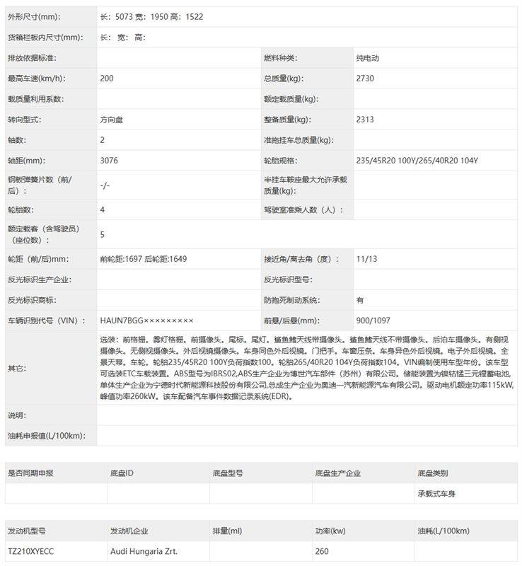 动力部分,一汽奥迪A6L e-tron完成申报的两版车型均为单电机后驱,最大功率输出260kW,预计配备107kWh宁德时代三元锂电池,0-100kph加速成绩在6秒内,极速可达200kph,配备的轮胎规格为235/45R20 100Y/265/40R20 104Y,WLTC工况纯电续航预计在750公里左右。除了有单电机后驱版,一汽奥迪A6L e-tron在之后预计还有采用前后双电机+电动quattro四驱系统的高性能版车型。