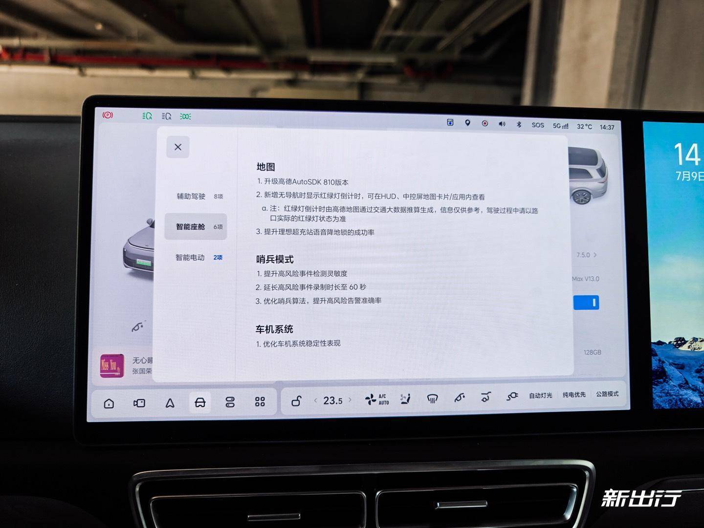 关于车机交互方面的体验倒是没有更新太多,主要是更新了高德地图的版本、新增红绿灯非导航读秒、哨兵模式的录制时长和稳定性都有所提升,整车的车机系统稳定性也有优化。