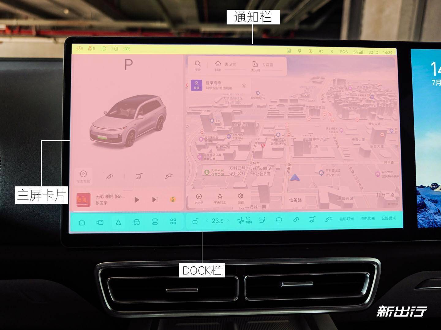 再来聊交互。其实在最近的几个版本,L 系列的中控交互界面基本框架已经定型了,主屏默认状态下由 70% 显示面积的主屏交互卡片+30% 的通知栏/DOCK 栏组成。