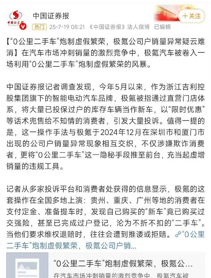 最近几天时间,有关于“0公里二手车”的消息甚嚣尘上,极氪、哪吒被《中国证券报》曝出通过先上险、后降价出售的方式,虚报销量,极氪方面已经进行了回应,核心说辞就一个,合理合规,没有作假,但是和媒体采访车主的表述背道而驰!哪吒汽车事实上已经崩溃,因此现在也是一种闭目待锤的状态,爱说啥说啥的态度……