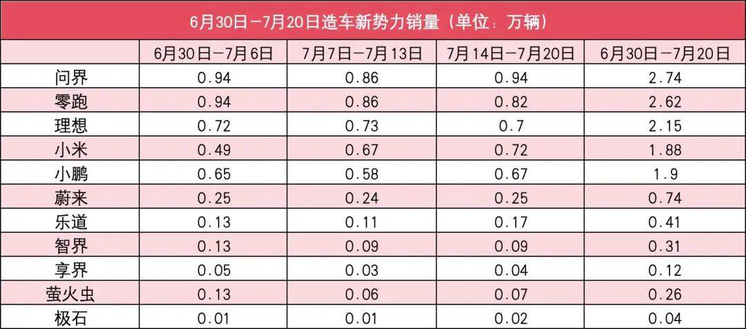 蔚来则依旧排在第六位。7月14日-7月20日,蔚来销量为0.25万辆,较前一周增长了0.01万辆。另外,乐道销量为0.17万辆,较前一周增长了0.06万辆;萤火虫为0.07万辆,较前一周增长了0.1万辆。上周,蔚来三个品牌合计销量为0.49万辆,较上一周增长了0.08万辆。