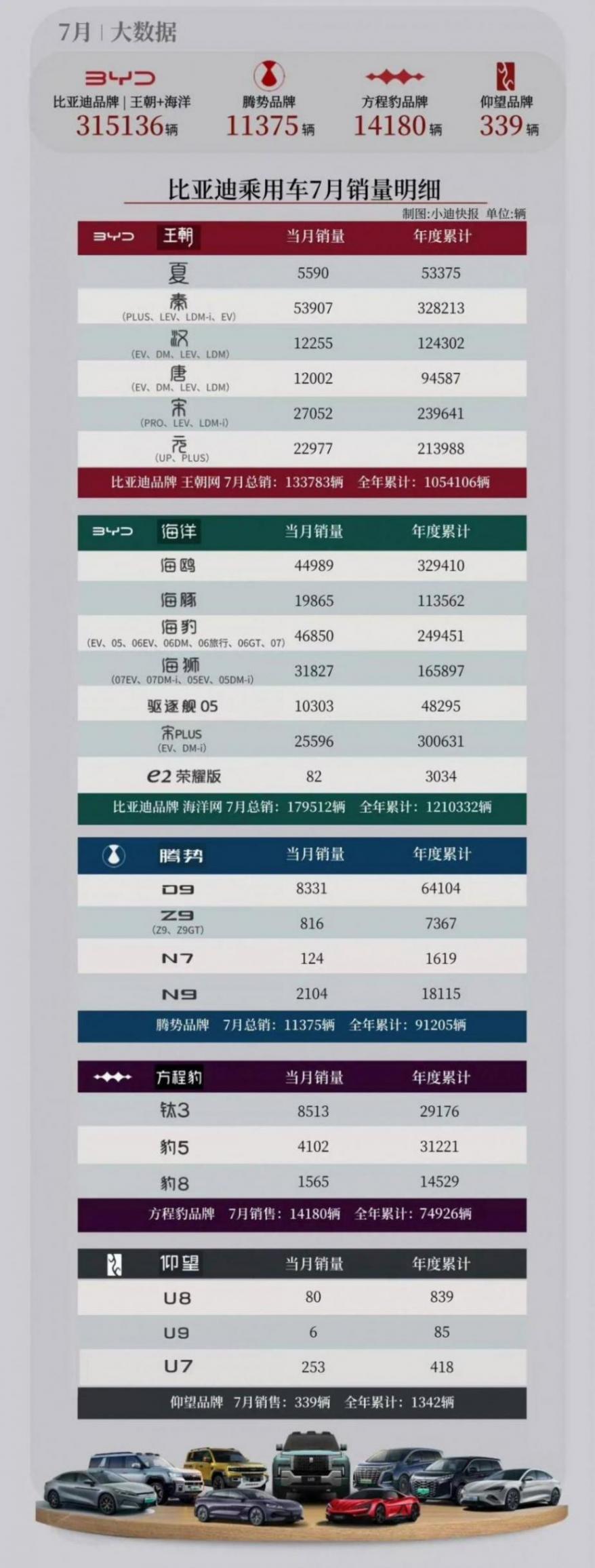 至于仰望,7月销量为339辆,包含U8的80辆,U9的6辆,U7的253辆。