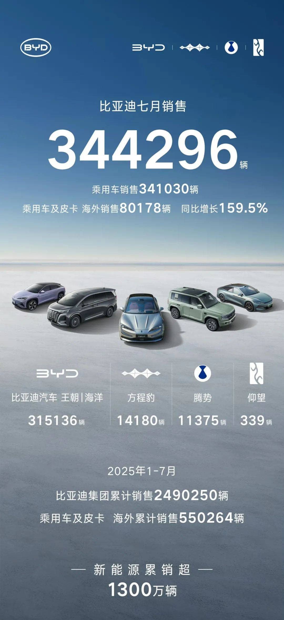 包含夏共售出新车5,590辆;秦家族(秦PLUS、秦 PLUS EV、秦L DM-i、秦L EV)共售出新车53,907辆;汉家族(汉EV、汉DM、汉L EV、汉L DM)共售出新车12,255辆;唐家族(唐EV、唐DM、唐L EV、唐L DM)共售出新车12,002辆;宋家族(宋PRO、宋L EV、宋L DM-i)累计共售出新车27,052辆;元家族(元UP、元PLUS)共售出新车22,977辆。