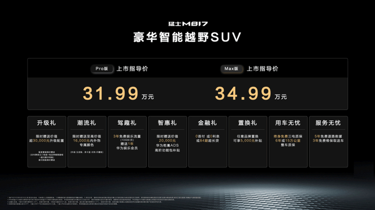 8月17日,东风猛士科技与华为联合打造的豪华智能越野SUV——猛士M817在成都正式上市。新车推出Pro版和Max版两款车型,售价分别为31.99万元和34.99万元。即日起至9月30日下订,用户还可享受至高价值超7万元的8重上市首销专属权益。猛士M817凭借“全感豪华、全栈华为、全域通达、全维安全、全能拓展”五大核心实力,重新定义了智能越野车的价值标杆。
