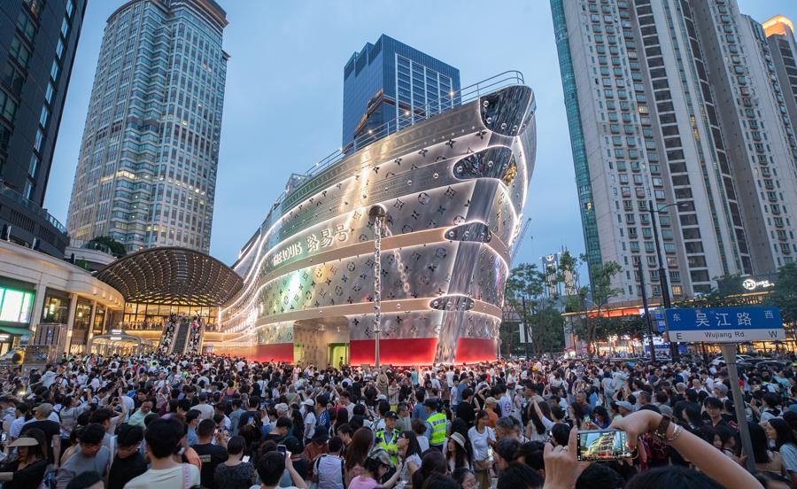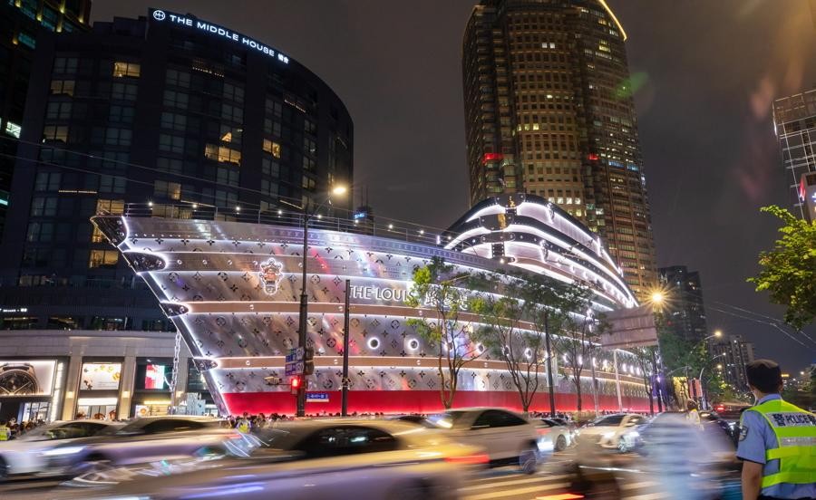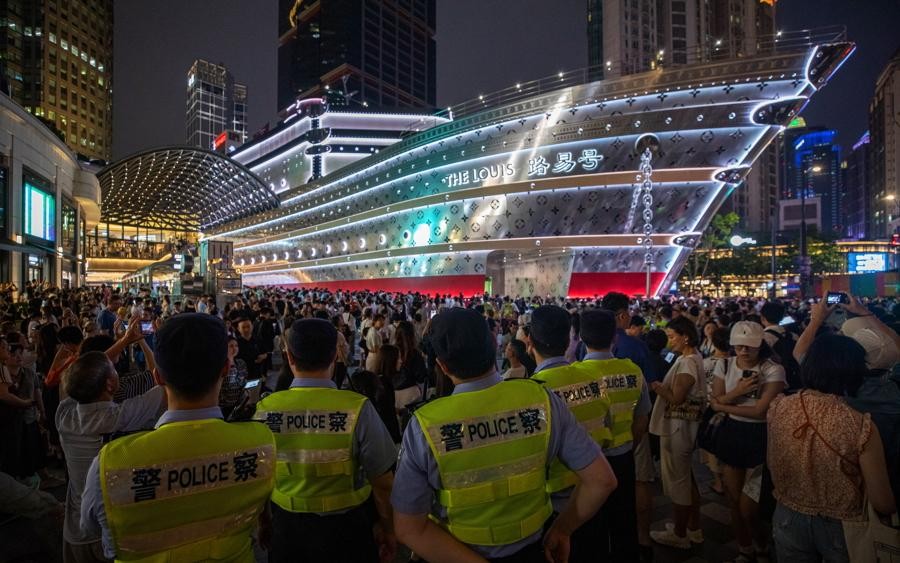 上海南京西路的LV“路易号”最近成了现象级打卡点,人流量大到让地铁站11号口直接“只进不出”,现场堪比春运火车站。这艘巨型轮船造型艺术装置,白天挤满了背着LV包来拍照的时髦男女,连大爷都穿上了印有LV标志的T恤来凑热闹;晚上亮灯后更是变身“行走的流量密码”,家长直接把孩子举过头顶,就为了抢个镜头。更夸张的是,星巴克门口都站满了“蹲点”的游客,警方甚至出动喇叭反复喊话提醒安全。这艘船简直成了上海的新地标,连警察蜀黍都在旁边维持秩序,生怕大家挤坏了“路易号”。不知道各位读者有没有去打卡?评论区聊聊你挤没挤到这个“海上巨无霸”?