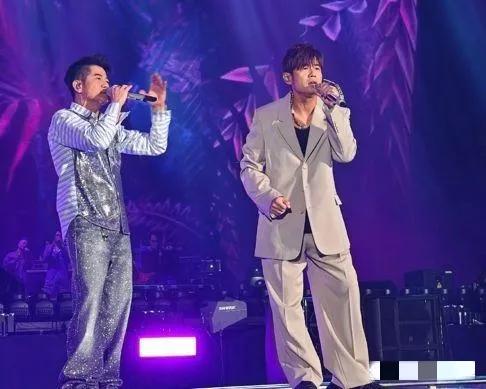 有网友拍到后台花絮:演出结束周杰伦笑着捶郭富城胸口:“哥你这腹肌是借的吧?比我演唱会门票还难抢!”