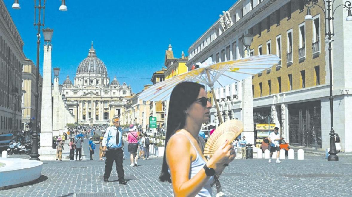 据法新社1日报道,由于高温,包括罗马在内的18座意大利城市处于红色预警状态。图为1日,一名女子在罗马街头撑伞行走。(视觉中国)