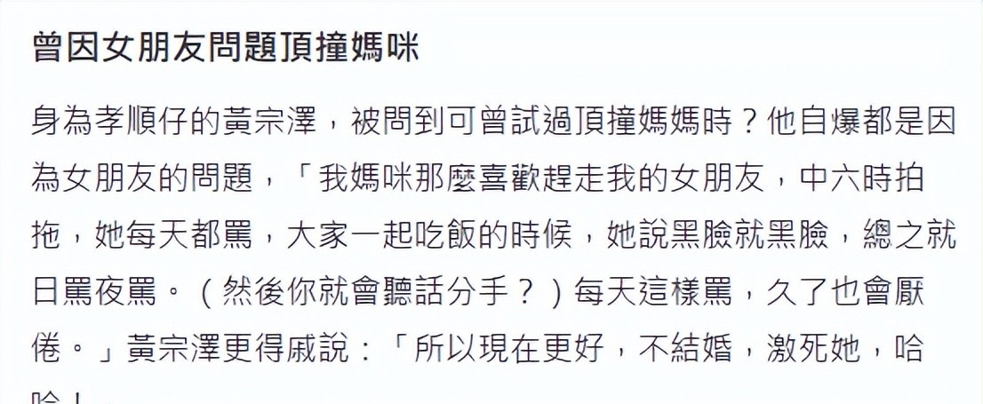 前几天在微博上刷到了一个关于黄宗泽的采访片段,还跟同寝室的朋友们一起聊到。黄宗泽今年44岁了,他和胡杏儿当年恋爱八年的故事大家应该都听过一耳朵,结果没想到在最新的采访里,黄宗泽突然说,自己到现在不结婚,其实是想气妈妈,算是小小报复她一下,因为他初恋时候的女朋友就是被妈妈棒打鸳鸯而分手的。