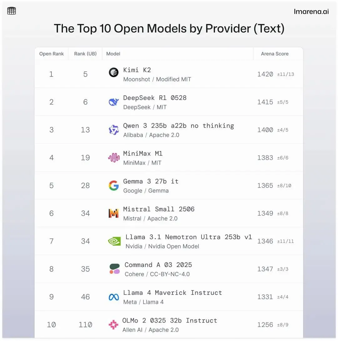 第一列是开源模型内的排名,前四都是国产开源模型,Kimi K2 排在第一名;第二列是所有(开源和闭源)模型中的排名。图片来源:https://lmarena.ai/leaderboard/text