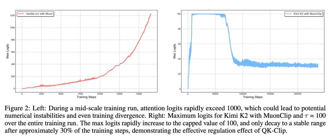 注意力权重爆炸问题大多出现在超大规模的大模型训练中,这也是此次 Kimi K2 万亿参数能够成功训练的重要突破之一。