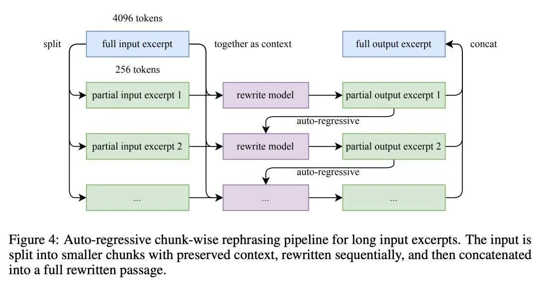 数据改写流程,将输入拆分为保留上下文的小块,按顺序重写,然后拼接成完整的重写段落。