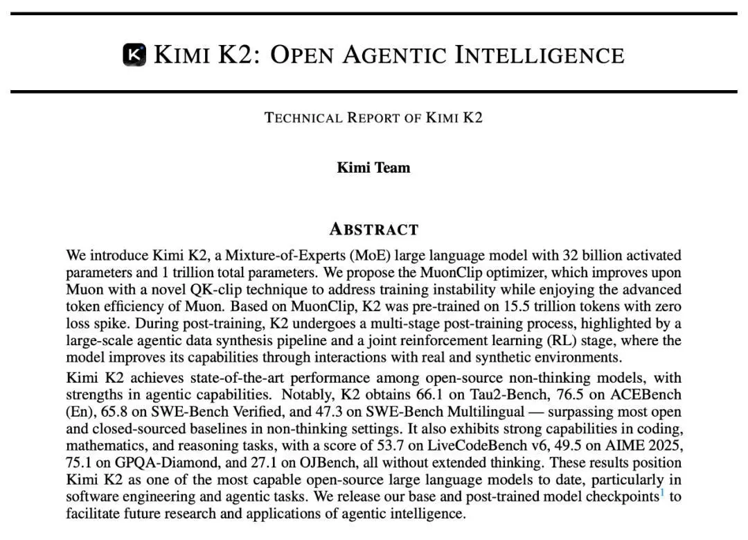 就在大家还在讨论这些差异、参数规模、以及模型路线时,Kimi 今天又放出了一份干货:Kimi K2 的技术报告正式发布。
