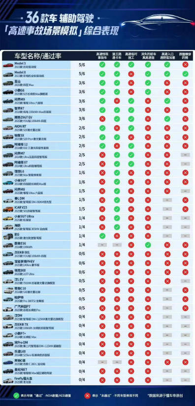测试结果可以看到,在六类高速场景测试中,36款车型累计完成了183次测试,但仅有44次测试被评为“通过”,整体通过率仅为24%。而在九类城市道路场景中,参与测试的车型数量为26款,总测试次数达233次,通过103次,通过率约为44.2%。即便城市道路的辅助驾驶表现优于高速场景,但仍没有达到让人“完全放心”的地步。