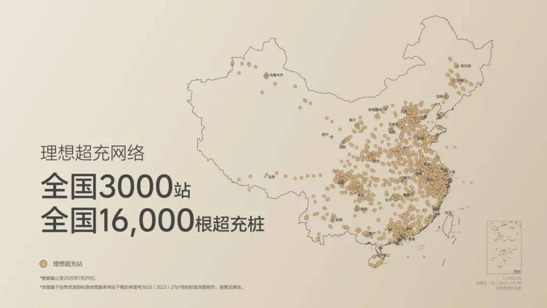 为了支撑5C超充,而且为了解决里程焦虑的问题,一两个桩不管用,得需要覆盖面足够广的超充网络。目前,理想已经建成了3000站超充站和16000根超充桩,在全国高速核心路段皆有贯通,城市超充站也覆盖了256座城市。